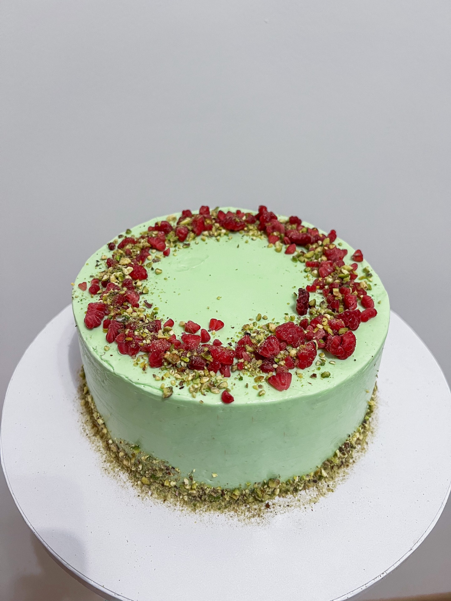 Ochutnejte náš pistáciový dort, který je plný pistáciové chuti skloubené s chutí malin.